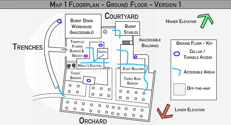- The lower area was redesigned, swapping the majority of the orchard for trellises for grape bushes, the tiered levels for a smooth incline with the vineyard growing there, and a small building with small, raised windows that provided cover and sightlines to the two buildings and the bell tower. The nature of the trellises repeated rows gave the lower area an almost cornfield-like effect, with players able to disappear into the rows as partial cover. Their single-direction placement limited movement, with the trade-off being almost full cover to all except those atop the bell tower, and led to some very interesting interplay in the playtests.