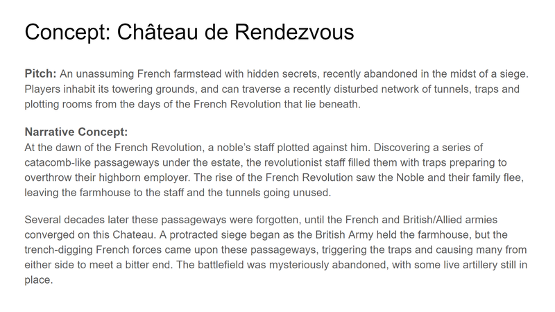 - Historical Believability - The level needs to have a strong visual identity and narrative, and be believably ground in the era it is set. The Chateau's geometry should reflect its revolutionary roots, the siege and subsequent battle should be reflected throughout, contrasting a typically peaceful setting with the scars of war and shadows of conspiracy